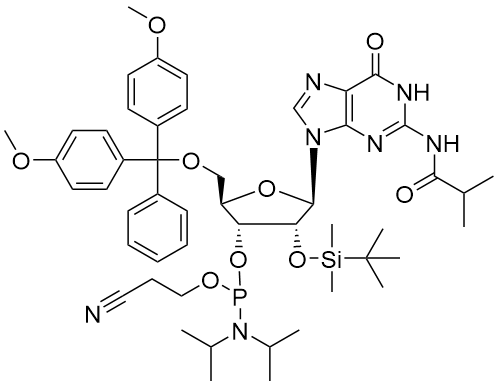 中文名称:5'-O-DMT-2'-O-叔丁基二甲基甲硅烷基-N2-异丁酰基鸟苷3'-CE亚磷酰胺